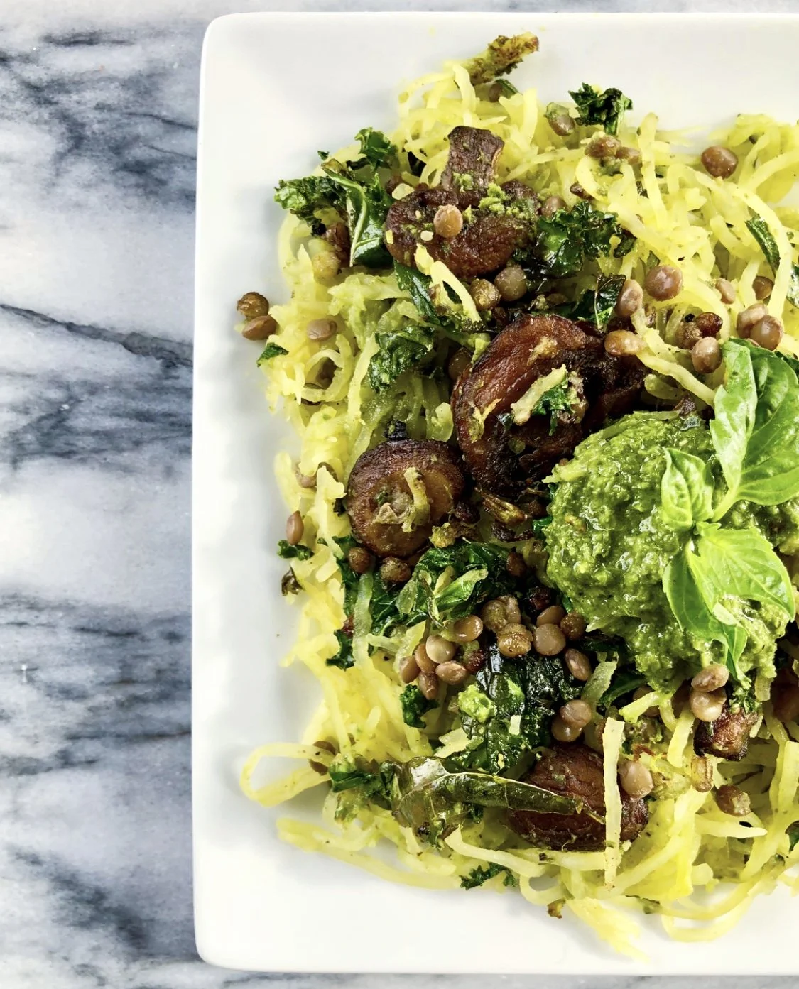 Pesto Spaghetti Squash with Lentils, Kale, & Mushrooms